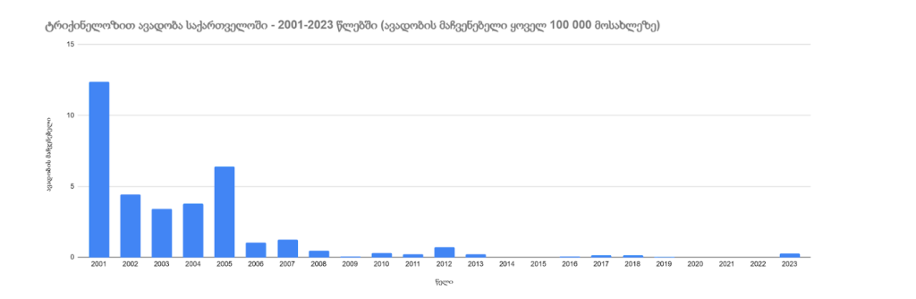 2023 წელს დაფიქსირდა — ოფიციალურად დარეგისტრირდა 10 შემთხხვევა. მიუხედავად იმისა, რომ ეს მაჩვენებელი შედარებით დაბალია, ის გვახსენებს, რომ ტრიქინელოზი კვლავ აქტუალური საფრთხეა, განსაკუთრებით იმ პირობებში, როცა ვეტერინარული კონტროლი და საზოგადოებრივი ცნობიერება არასაკმარისია.