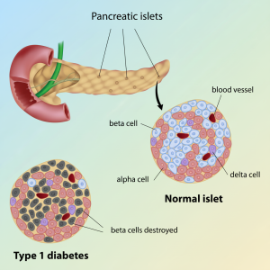 ტიპი 1 დიაბეტს იწვევს სხეულის საკუთარი იმუნური სისტემის გაუმართავი მუშაობა, რა დროსაც ის უტევს პანკრეასის უჯრედებს, რომლებსაც ბეტა-კუნძულებს (beta islets) უწოდებენ.